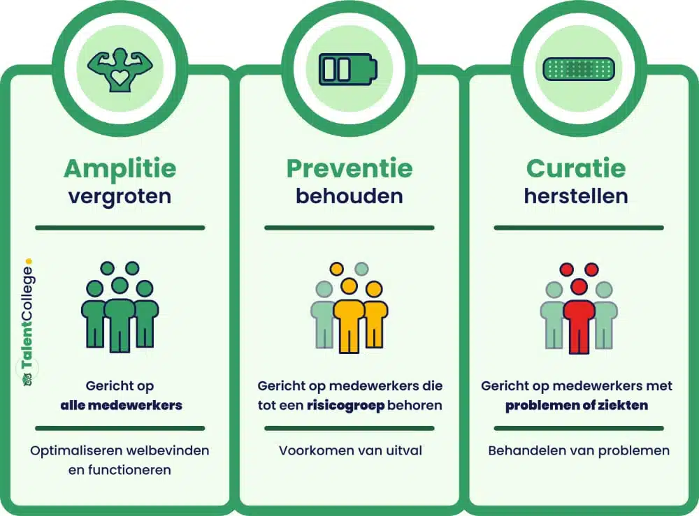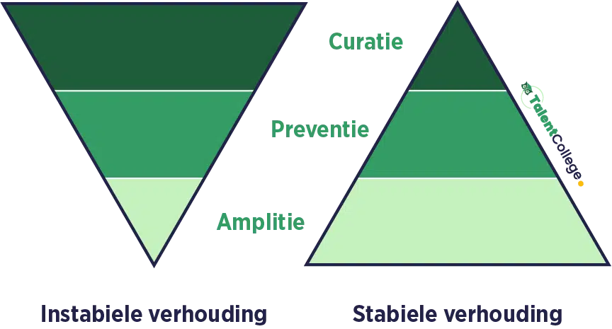 Curatie, preventie en amplitie hebben elk een eigen rol binnen organisaties. Curatie richt zich op herstellen wat niet goed gaat. Preventie richt zich op het voorkomen van problemen en risico’s. Amplitie richt zich op het versterken van wat gewenst is, zodat ontwikkeling ontstaat.